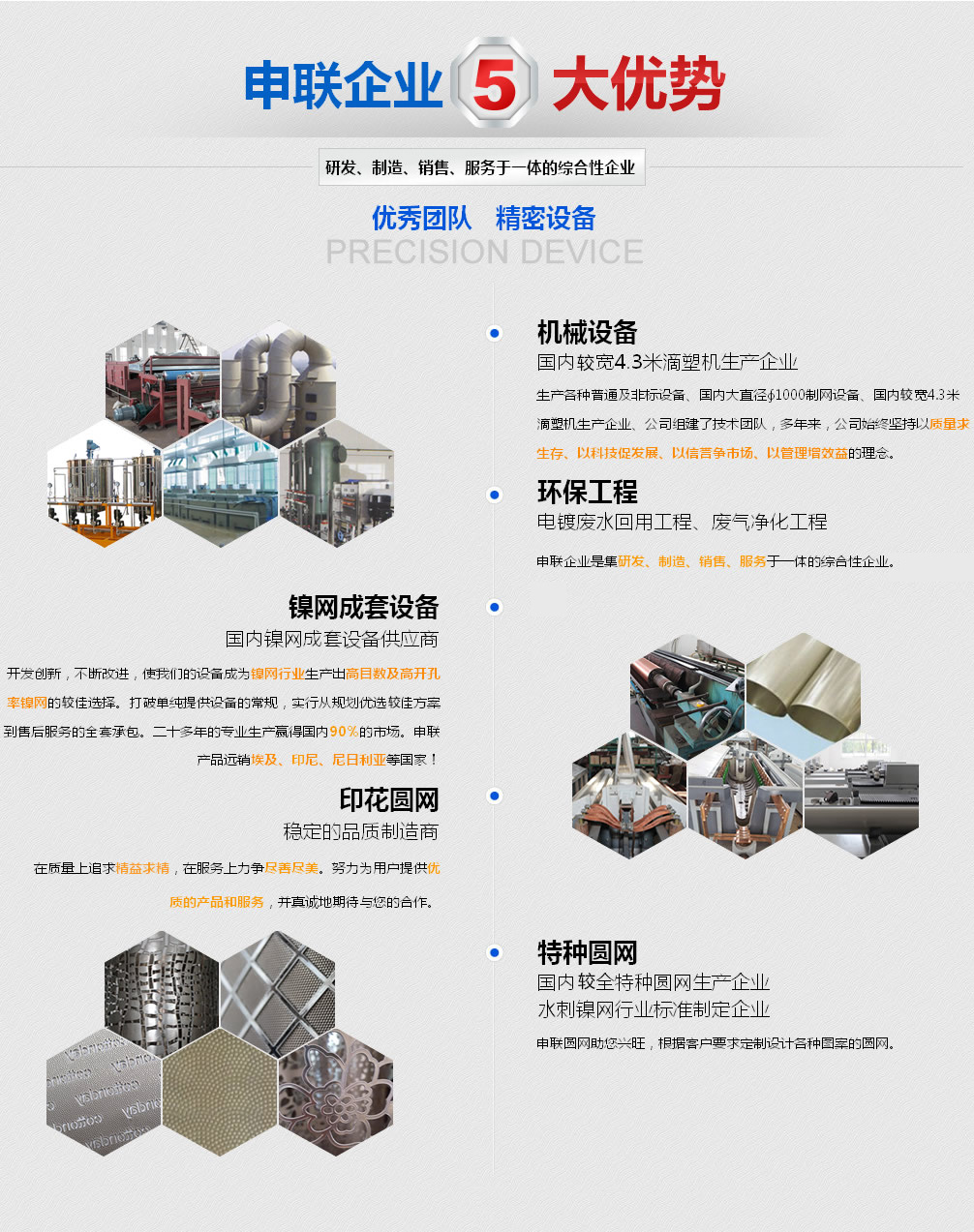 申聯(lián)企業(yè)是一家集機械設(shè)備、環(huán)保工程、鎳網(wǎng)生產(chǎn)成套設(shè)備、印染鎳網(wǎng)、特種鎳網(wǎng)等系列相關(guān)產(chǎn)品的研發(fā)、制造、銷售、售后服務(wù)于一體的綜合性企業(yè)。企業(yè)屬下有宜興申聯(lián)機械制造有限公司和宜興市申聯(lián)環(huán)保紡織器材廠有限公司。